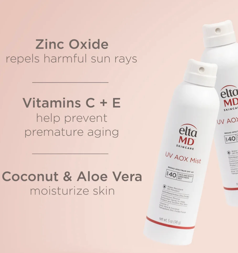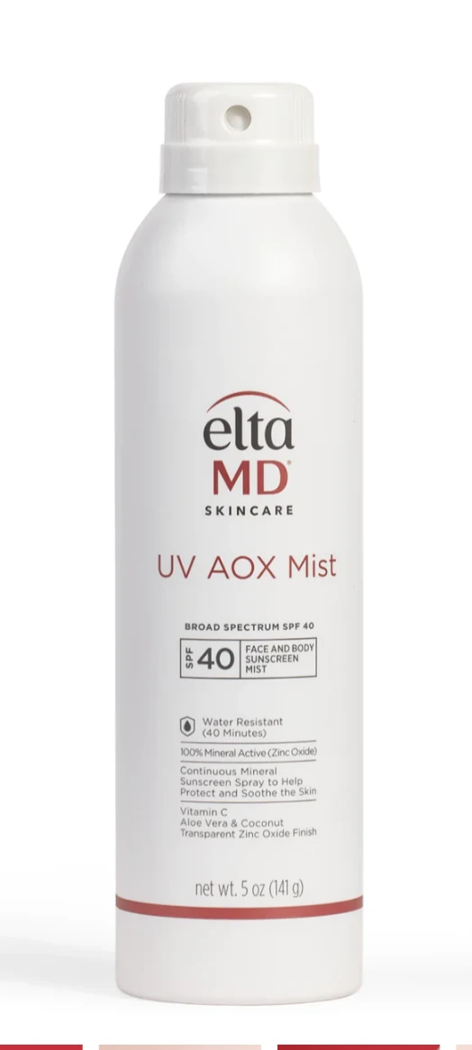 Enjoy a reimagined sunscreen spray experience with EltaMD UV AOX Mist SPF 40 — a sheer-finish 100% mineral sunscreen spray that’s enriched with antioxidants to help prevent premature aging and rejuvenate skin. This lightweight and water-resistant formula is gentle enough to wear daily and leaves skin feeling hydrated and moisturized. With our white-to-clear technology, the only time you see the sunscreen is when you’re spraying it on (so you don’t miss a spot!). It conveniently absorbs into the skin within seconds and blends flawlessly into all skin types — no streaks, patches or white cast in sight.